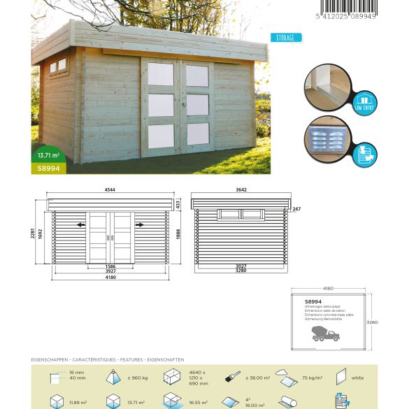 Le chalet S8994 est équipé d'une double porte vitrée sécurisée et d'un toit plat.