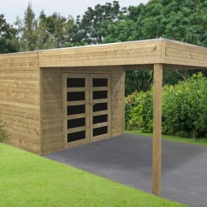 Abri de jardin 19 mm traité MATERA – 8,69 m² avec terrasse couverte. Dim. 2988 x 2908 + 2870 mm.
