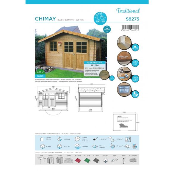 L'abri de jardin Chimay est en sapin blanc du nord de 28 mm d’épaisseur. Il possède une double porte avec ouvertures et une fenêtre en verre trempé. La pente du toit est de 16°.