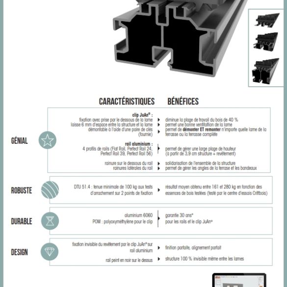 Flat rail, une structure aluminium démontable et remontable garantie 30 ans + 32 clips pour fixation de 16 lames. Dim. 12 x 55 x 1984 mm. Non porteur.
