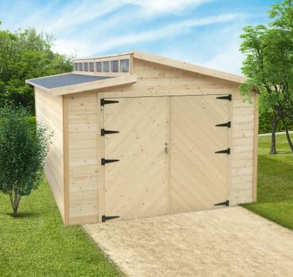 Le garage en bois Torino est réalisé en sapin du Nord et possède une large porte battante. Les fenêtres installées au niveau du toit permettent d'avoir une belle luminosité.