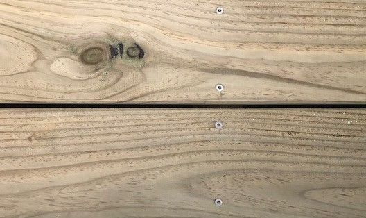 - Visserie : Fixez les lames méthodiquement par rangs, en allant d’un côté de la terrasse à l’autre, rangée après rangée. Veillez à préserver un espace de 5 mm entre les bords des lames, et 1-2 mm à leurs extrémités. Les lames de terrasse sont vissées à l’aide de vis inox Torx 5x50 mm.