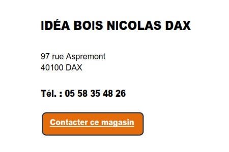 Bienvenue dans notre magasin de bois à Dax, situé au cœur des Landes ! Idea Bois Nicolas, entreprise familiale experte du bois depuis 3 générations, vous accueille dans son showroom dédié à la construction, à l’aménagement extérieur et à la décoration intérieure. Le magasin Idéa Bois Nicolas à Dax regroupe une équipe d'experts disponibles en magasin et en ligne pour vous renseigner et vous guider dans votre projet.