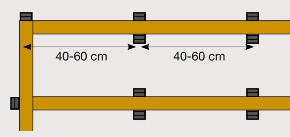 Les cales doivent être espacées entre 2 points d'appui de 40 à 80 cm selon l'épaisseur de la lambourde.
