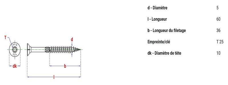 Vis spéciale construction bois 5x60 mm. Embout Torx 25.