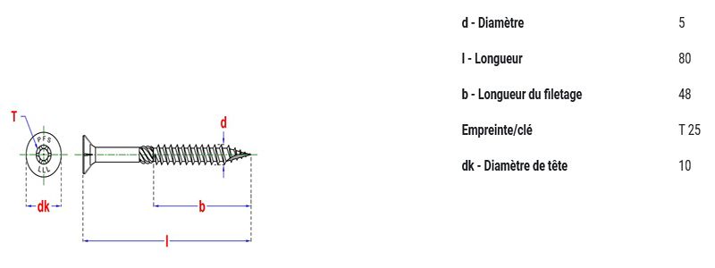 Vis spéciale construction bois 5x80 mm conçue pour tous les types d’application. Torx 25 - Tête fraisée - Filetage partiel.