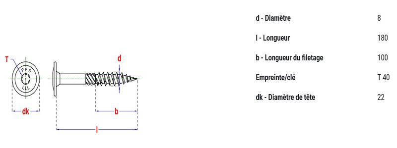 Vis de construction bois Ø 8 x 180 mm en acier zingué. Torx 40. Tête cylindrique - Filetage partiel.