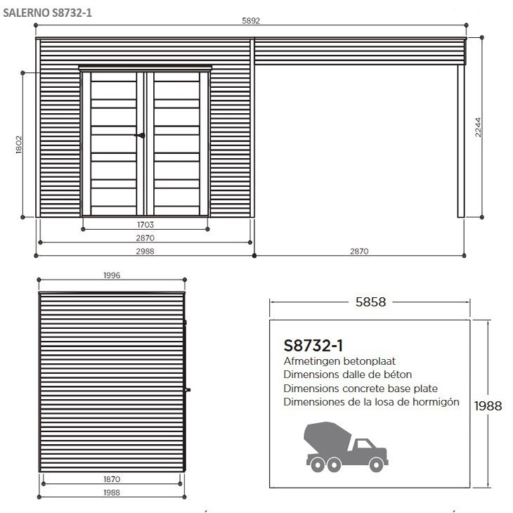 L’abri doit être monté sur une dalle de béton de 5858 x 1988 mm. Placez une bâche plastique sous votre dalle béton pour éviter l'humidité remontante. Le montage du chalet est simple grâce à son système Mount & Match (système de panneaux muraux prémontés placés les uns contre les autres latéralement ou perpendiculairement, puis reliés entre eux).