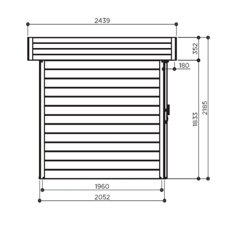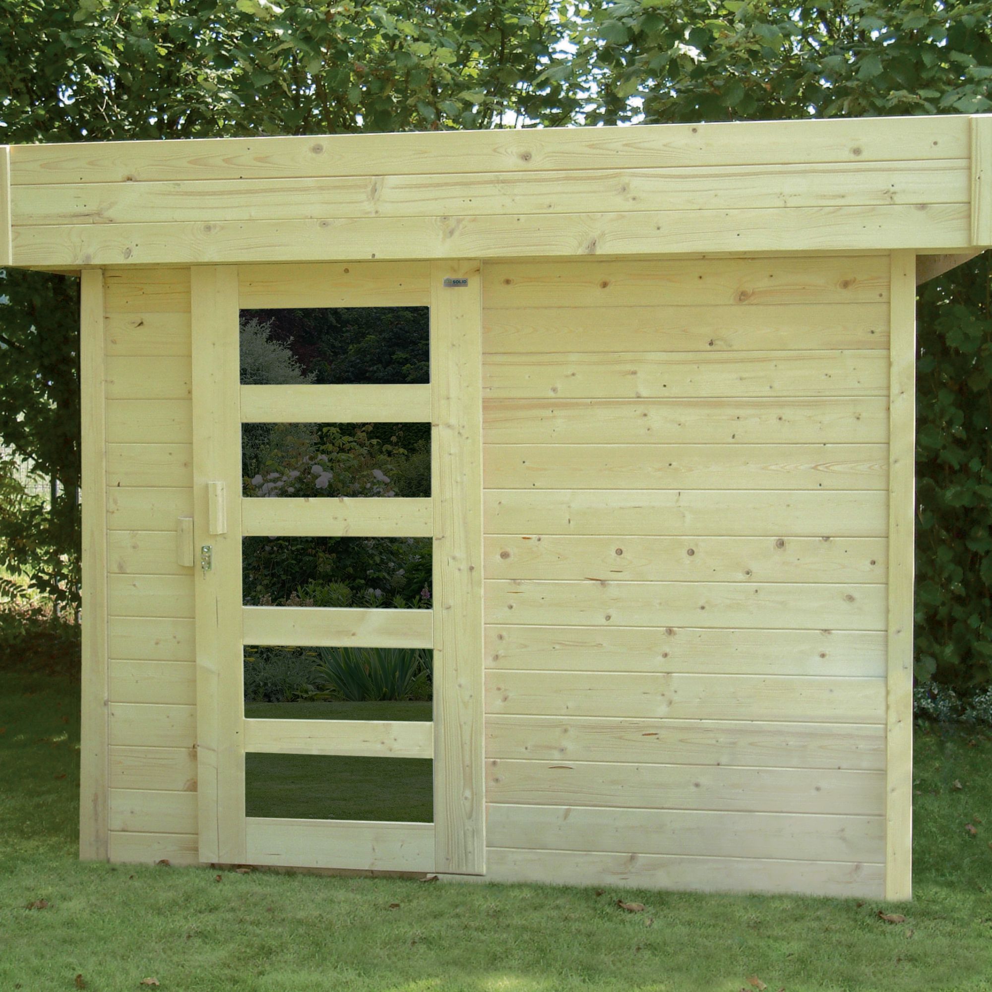 De plus, son toit plat et sa porte coulissante avec verre acrylique opaque et serrure donnent inévitablement un style moderne à cet abri de jardin en sapin du nord assemblé à l'aide de madriers de 28 mm d'épaisseur.