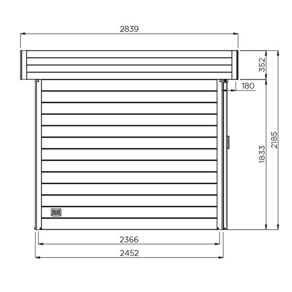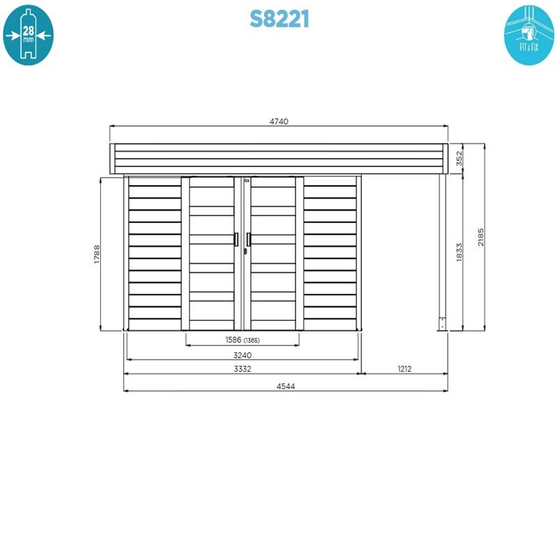 Pour plus de confort, l'abri S8221 est équipé d'une double porte vitrée sécurisée et son toit plat est recouvert d’une toile bitumée (roofing). Les murs ont une épaisseur de 28 mm.