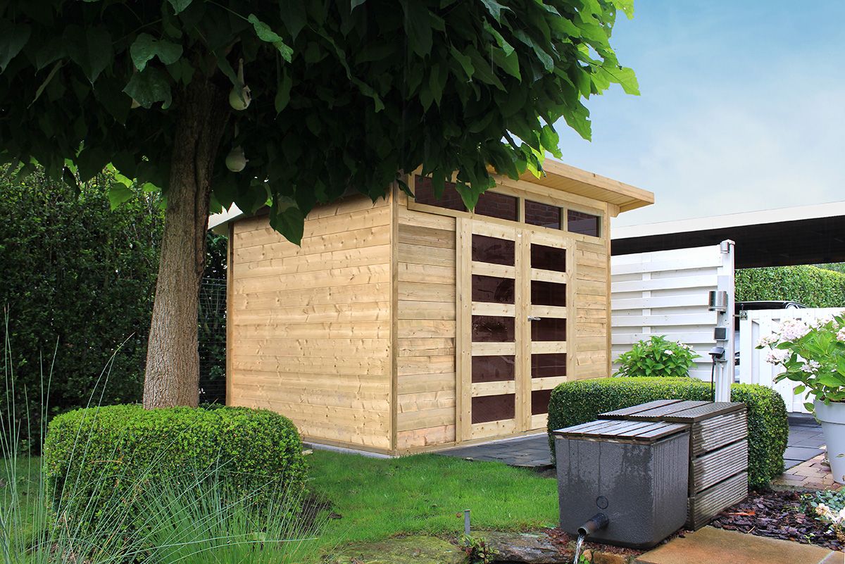 Le toit plat en roofing donne un style moderne à cet abri de jardin en sapin du nord. Attention, il est vendu non peint.