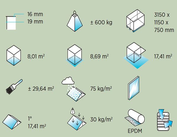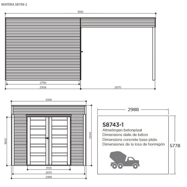 L'abri Matera dispose d’un toit plat composé de voliges 16 mm recouvertes d’une membrane EPDM étanche. Il doit être installé sur une dalle de béton de 2,988 x 5,788 m. Son toit est incliné de 1° pour l’écoulement des eaux de pluie.