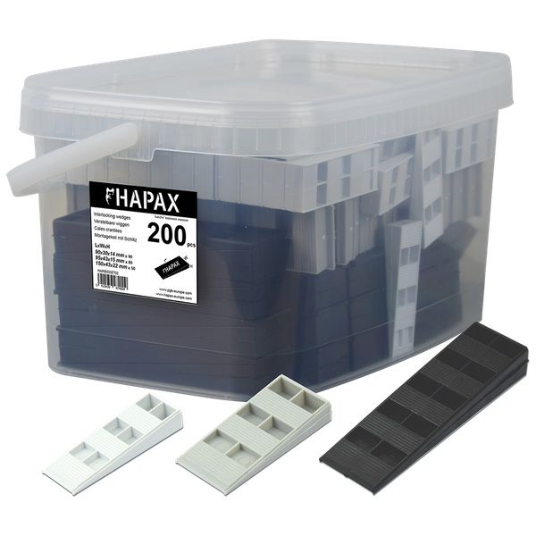 Assortiment de 200 cales crantées pour lambourdes terrasse hautement résistantes et indéformables. Ép. 14-15-22 mm.
