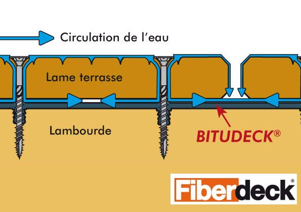 La bande d'étanchéité bitumeuse autocollante Bitudeck de Fiberdeck® est conçue pour allonger la durée de vie d'une terrasse. Elle s'applique directement sur les lambourdes pour limiter leur perméabilité au niveau des vis.