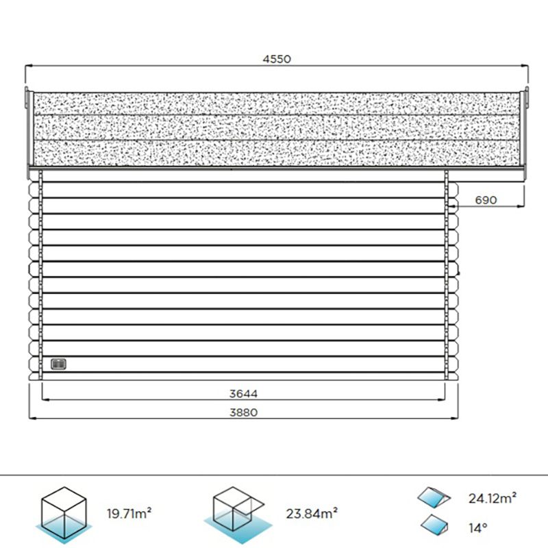 Il est livré avec une avancée de toit de 69 cm, 2 fenêtres en façade, un kit aération et son toit en roofing peut supporter une charge de neige de 75 kg/m².