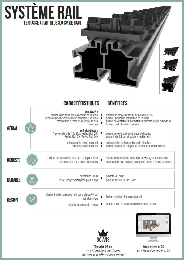 Flat rail, une structure aluminium démontable et remontable garantie 30 ans + 32 clips pour fixation de 16 lames. Dim. 12 x 55 x 1984 mm. Non porteur.