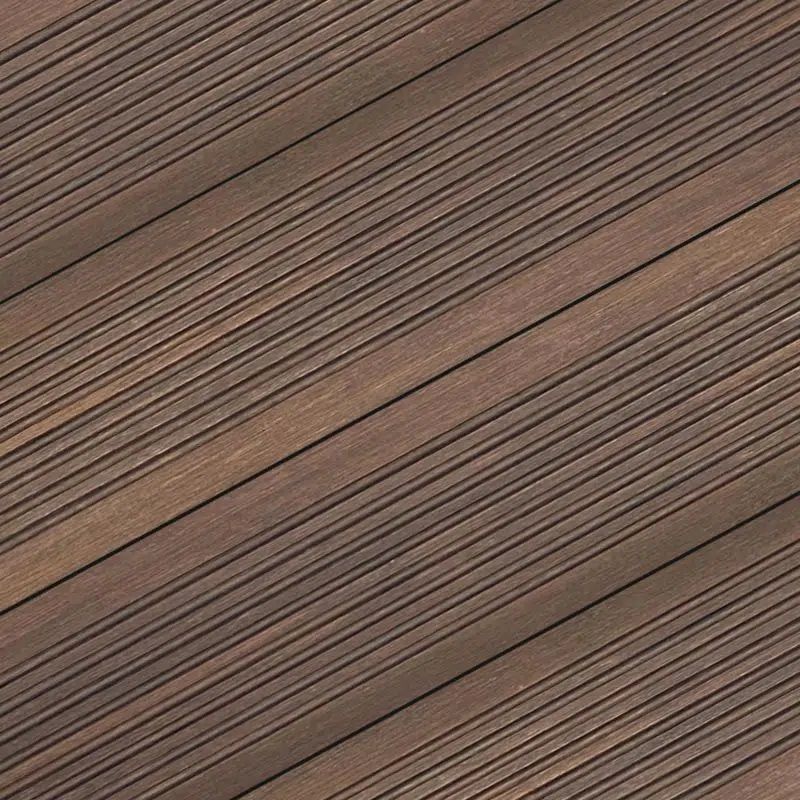 Proposée en coloris brun foncé, dans un profil double face, soit une face lisse brossée qui imite à s'y méprendre la fibre du bois, et une face striée pour limiter la glissance, cette lame de terrasse possède un rendu visuel naturel et chaleureux. Extrêmement dense et résistante, elle prendra une teinte argentée avec le temps.
