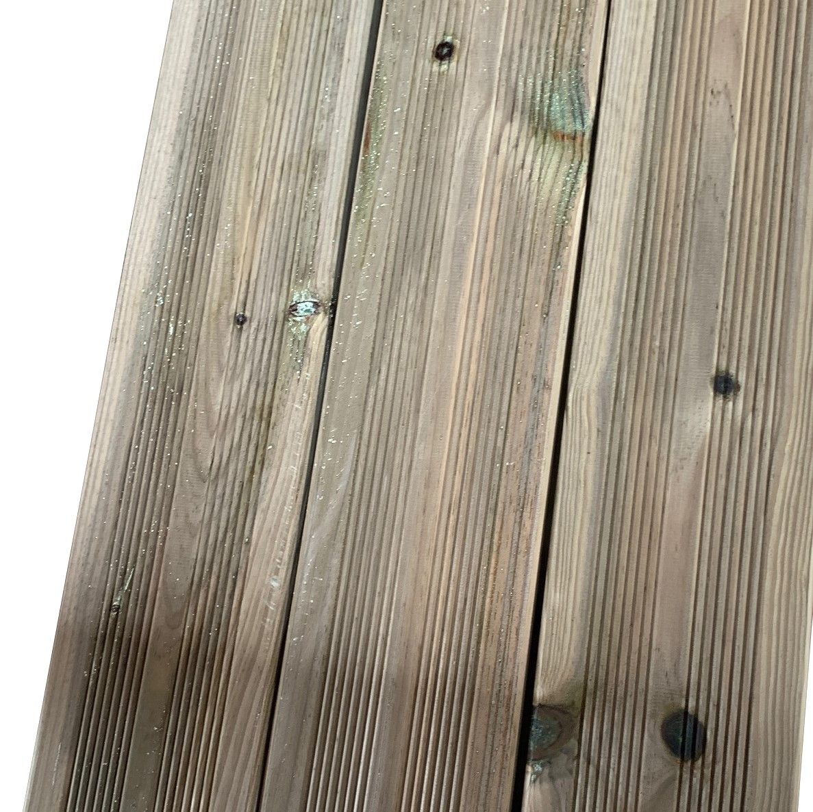 Le traitement Classe 4 protège votre plancher extérieur en pin des Landes des agressions climatiques et biologiques (insectes, pourriture et champignons). Cependant, des mousses peuvent apparaître sur le bois, particulièrement en cas de forte humidité ; pour celles-ci ou des salissures tenaces, utilisez un nettoyant un antimousse, puis rincez soigneusement.