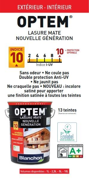L'Optem de Blanchon est une lasure mate ultra haute protection à base d'aqua-Polyuréthanes sans odeur destinée à tous types de boiseries extérieures, même celles directement exposées au soleil. De consistance crémeuse, elle ne coule pas et assure un confort d'application inégalé même sur des grandes surfaces verticales directement exposées au soleil, semblable à une lasure traditionnelle.