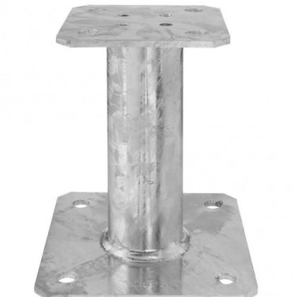 Pied de poteau en acier S235JR suivant NF EN 10025 galvanisé à chaud suivant NF EN ISO 1461, épaisseur : 4 mm.