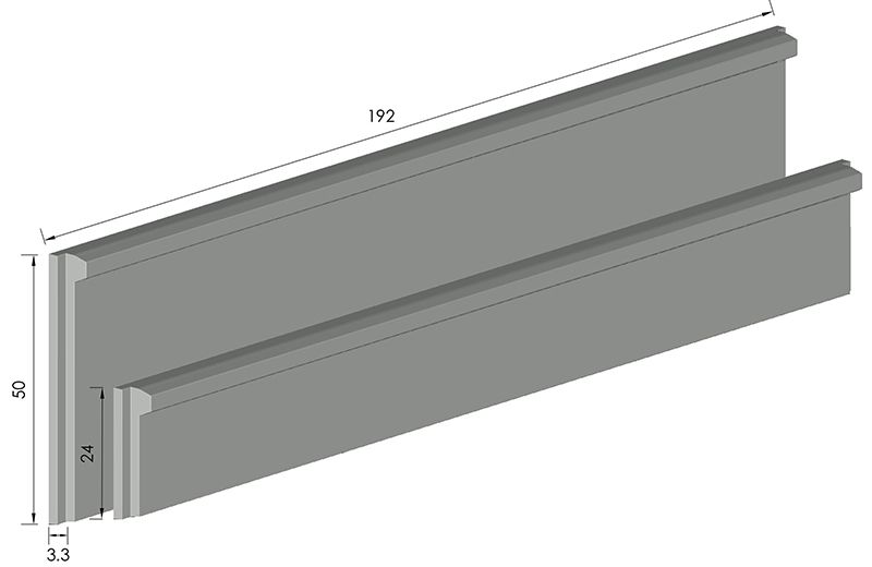 Plaque béton de soubassement avec demi‑chaperon intégré pour une clôture rigide et solide dès la base. Dimensions 1920x240x33 mm.