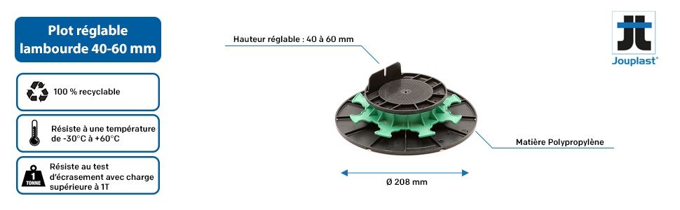 Plot réglable Jouplast pour la réalisation de terrasses en bois naturel ou en composite destinées à un usage piéton. Hauteur réglable de 40 à 60 mm. Fabrication française.