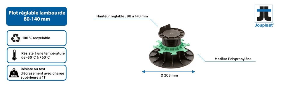 Plot réglable Jouplast pour la réalisation de terrasses en bois naturel ou en composite destinées à un usage piéton. Hauteur réglable de 80 à 140 mm. Fabrication française.