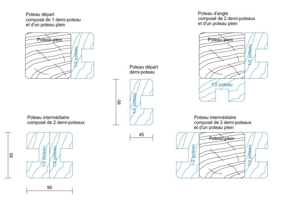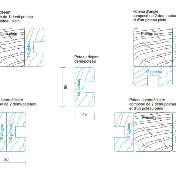 Grâce à un assemblage rainure/languette, les lames de clôture de 25 mm d’épaisseur s’empilent dans le demi poteau bois 9x9. Il suffit d’installer les poteaux à bonne distance les uns des autres et emboîter simplement les planches de clôture les unes au dessus des autres en terminant l’opération par l’ajout de lames de finition (droites ou bombées) de sorte à atteindre la hauteur souhaitée. Il est conseillé de fixer les lames de clôture dans le poteau bois avec des vis inox 5x50 mm. Il faut 2 vis par lame.