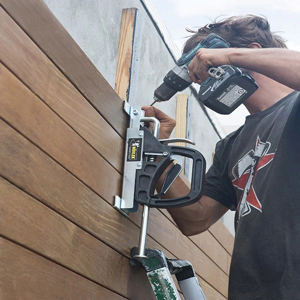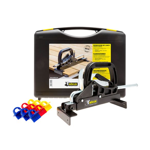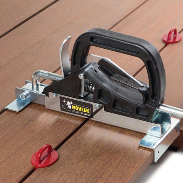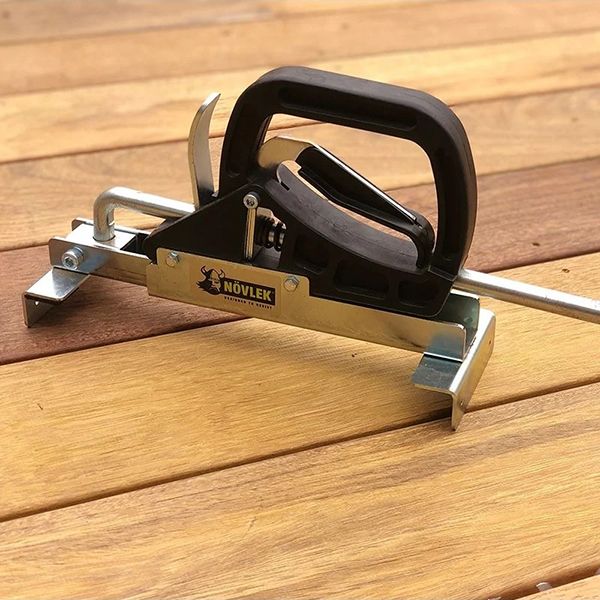 L'utilisation du serre-lames Növlek permet de resserrer, de redresser et de maintenir en place rapidement et sans effort les lames de terrasse et bardage en bois et composite.