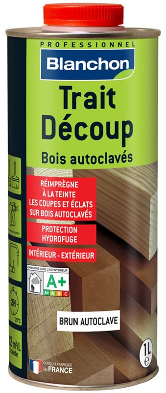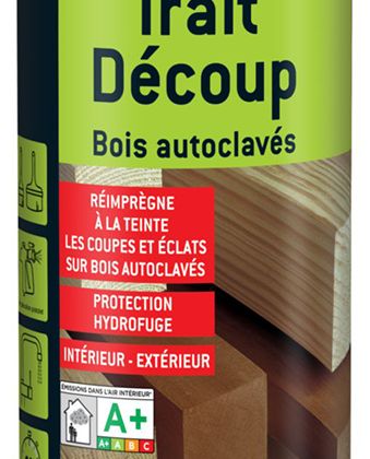 Traitement de très haute efficacité, Trait Découp est destiné à la préservation préventive de toutes agressions, à la restauration de l'aspect, et à la réimprégnation de tous bois traités en autoclave, présentant des impacts, éclats ou éraflures, ou ayant été coupés ou tranchés.