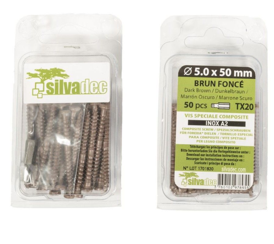 Les Vis inox brun foncé 5x50 mm en boite de 50pces sont assorties aux lames de terrasse Nuances IpéSilvadec. Elles permettent une finition soignée lors de la pose des profils de finition.