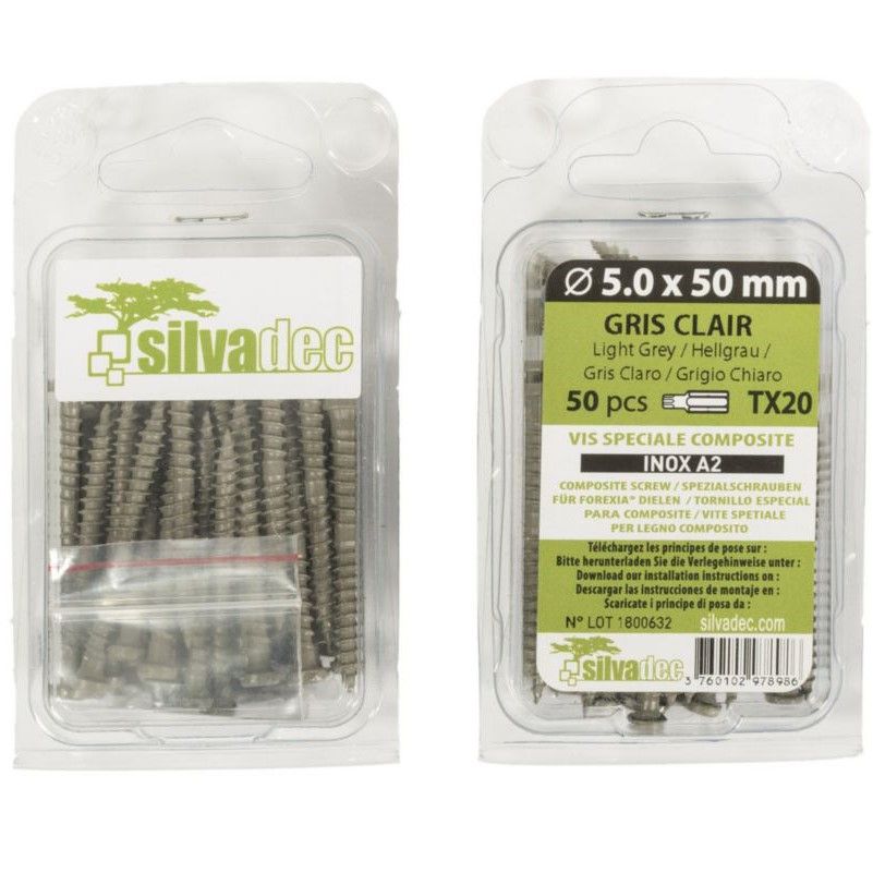 Les vis inox 5x50 mm sont assorties aux lames de terrasse composite Silvadec couleur gris. Elles permettent une finition soignée lors de la pose des profils de finition.